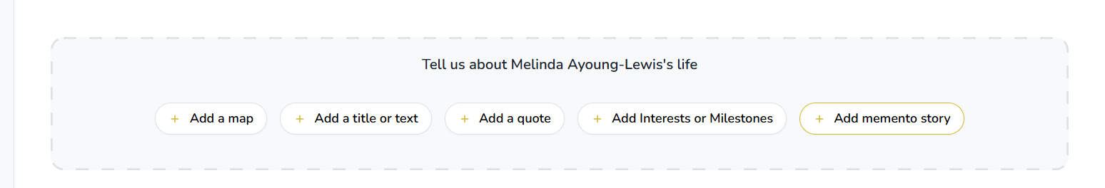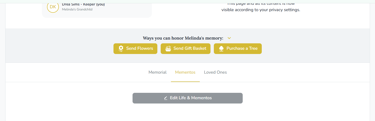 From the memorial page, select the Life & Mementos tab and click Edit Mementos.
