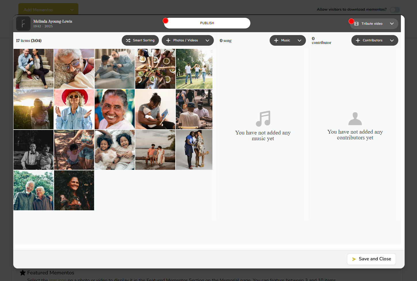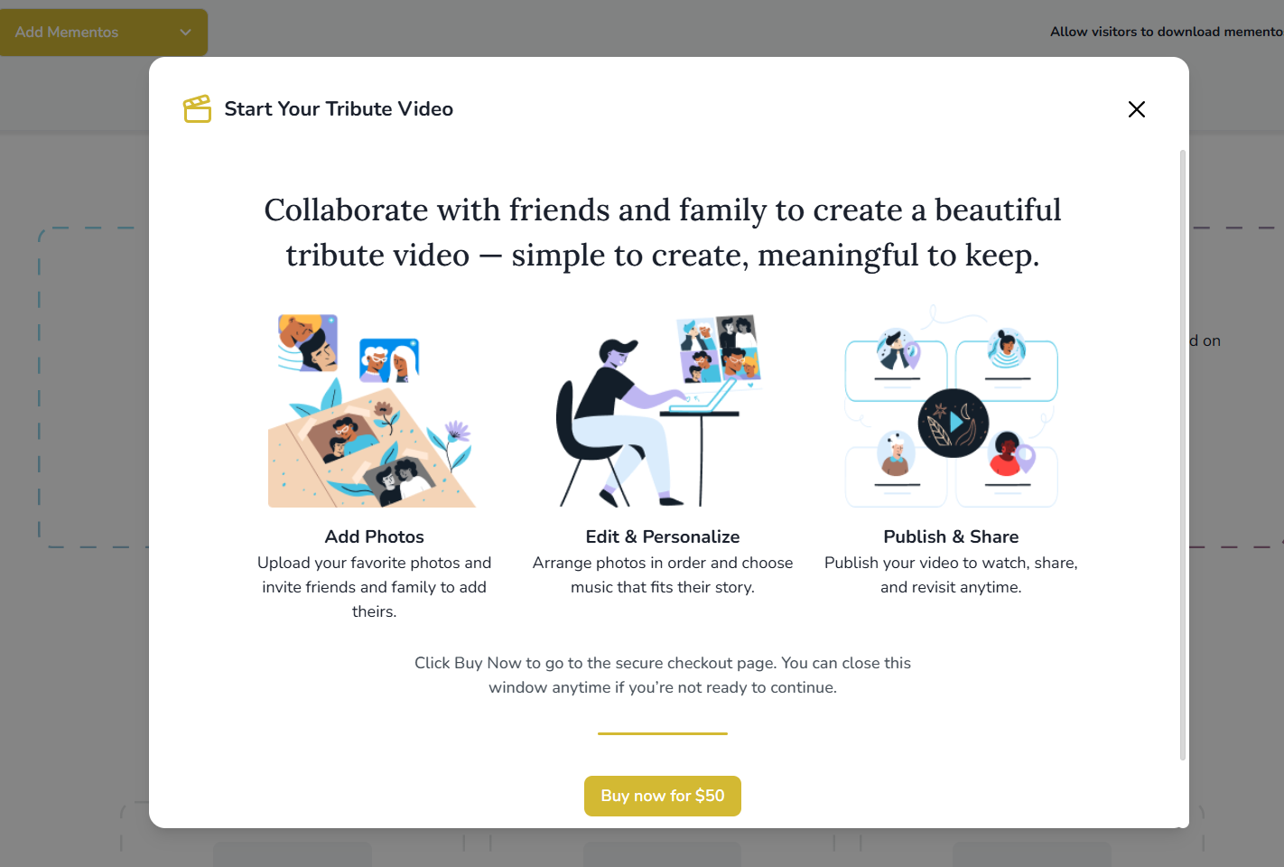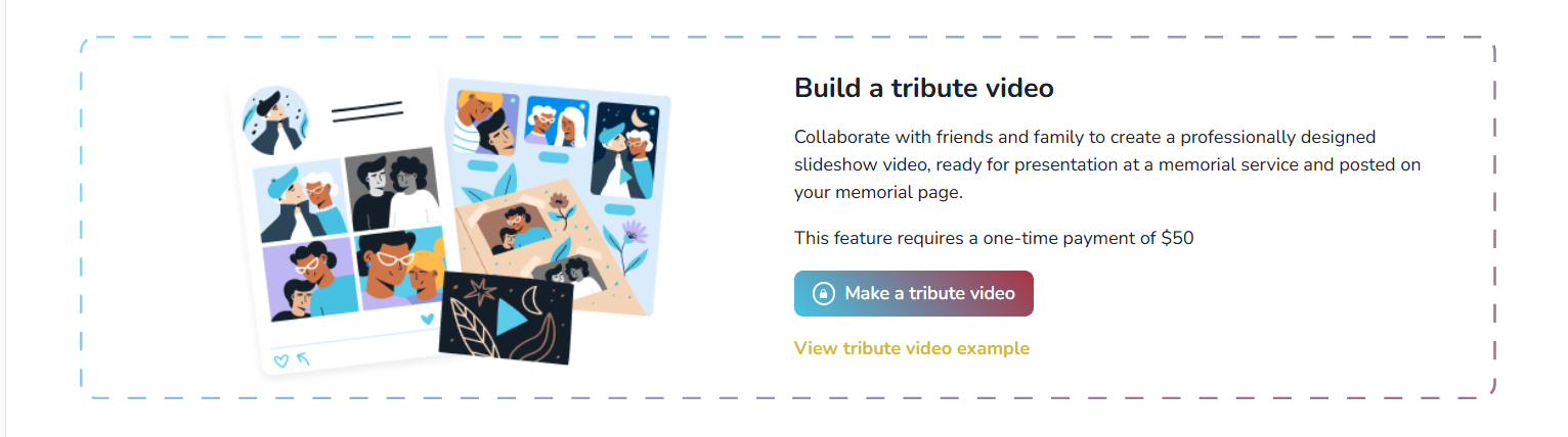 In most cases, family members are asked to complete a one-time payment before creating a Tribute Video. For organization memorials, this depends on how the organization has configured the feature.
