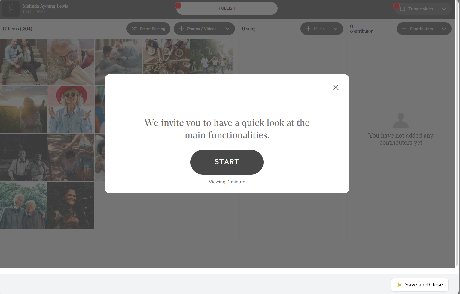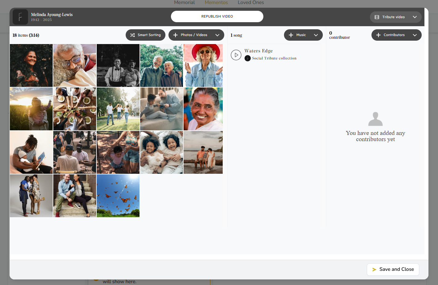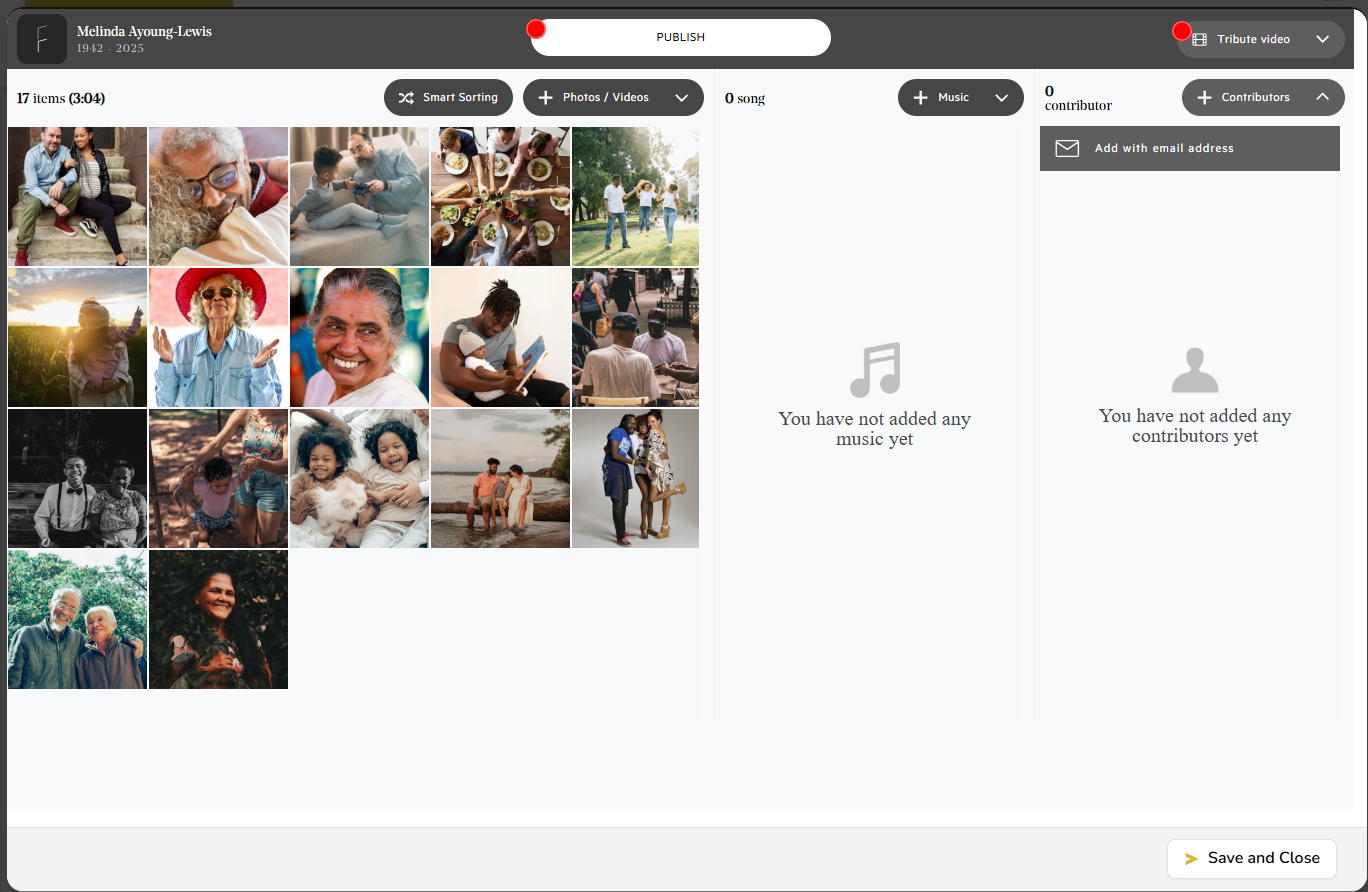 In most cases, family members are asked to complete a one-time payment before creating a Tribute Video. For organization memorials, this depends on how the organization has configured the feature.