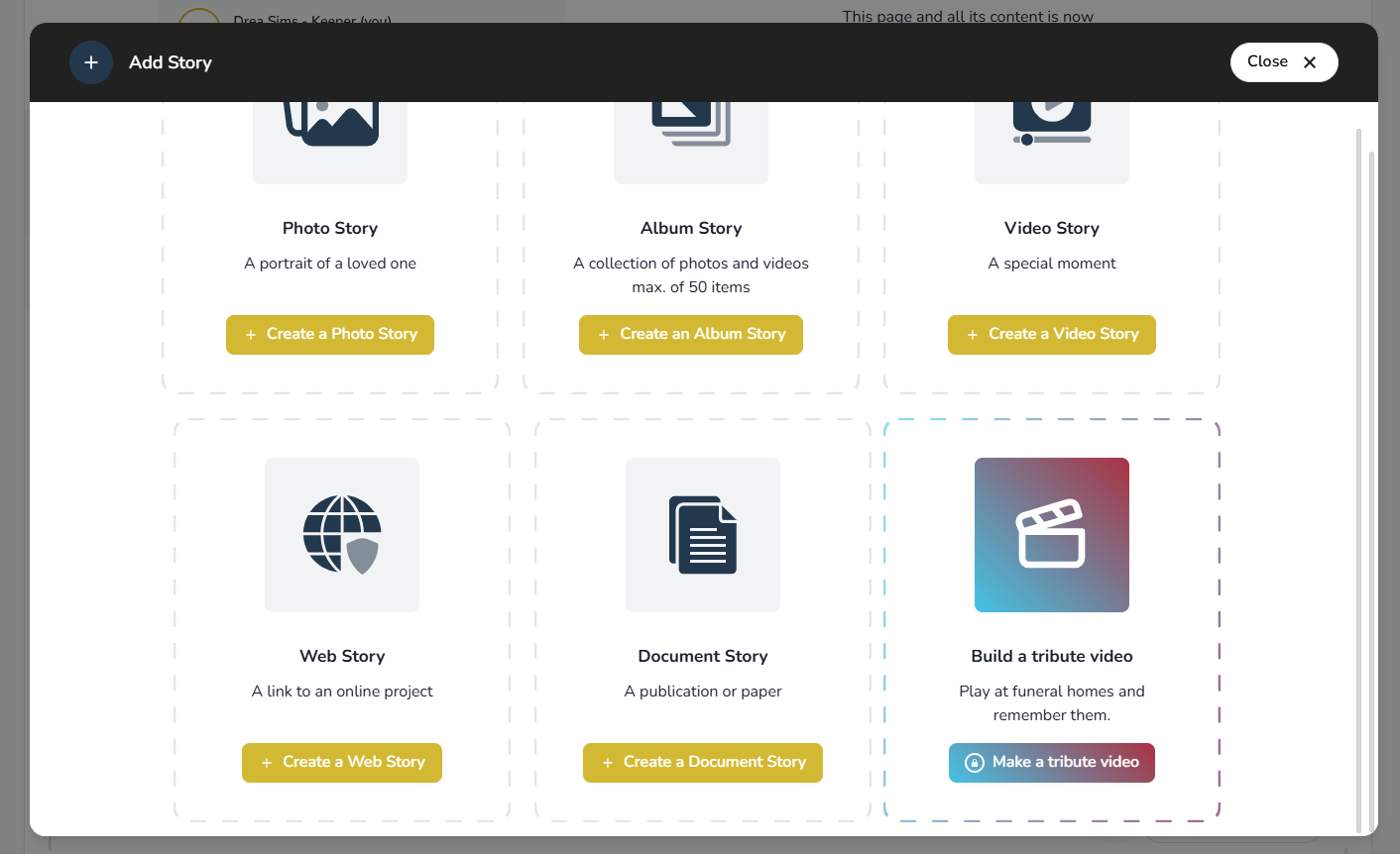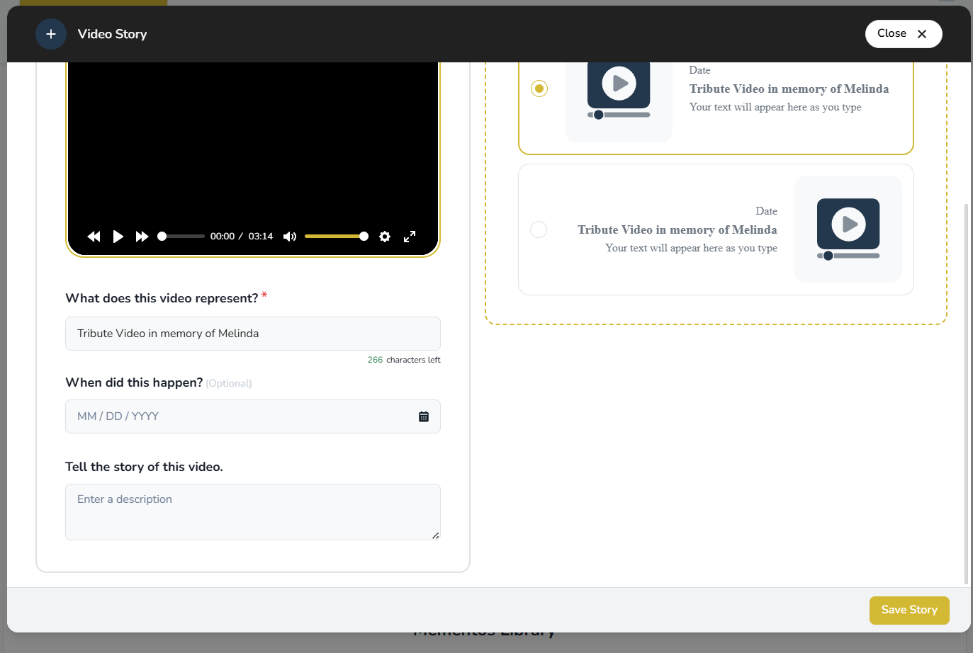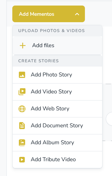 - Or select Add Mementos Story, where creating a Tribute Video is listed alongside other options such as milestones and quotes