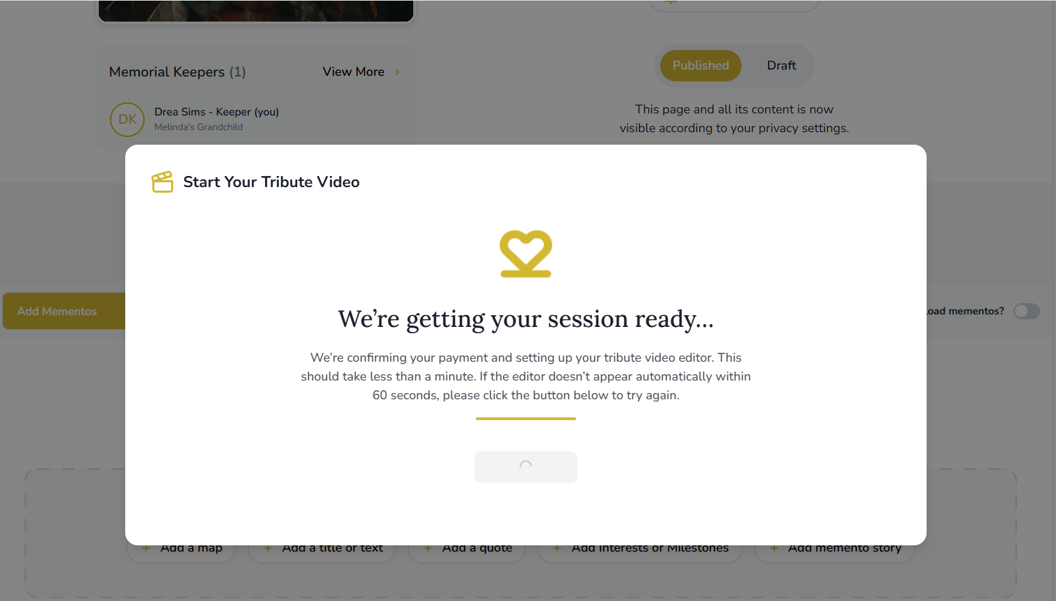 - The original modal updates to a loading state while your Tribute Video is prepared: