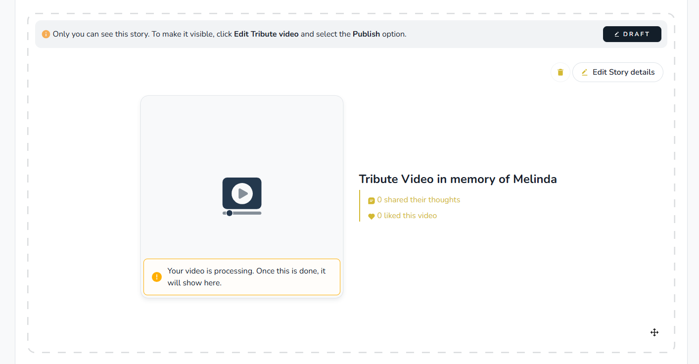 While you’re working, the video stays in Draft mode and isn’t visible to visitors. Simply click the “Draft” button to continue editing.